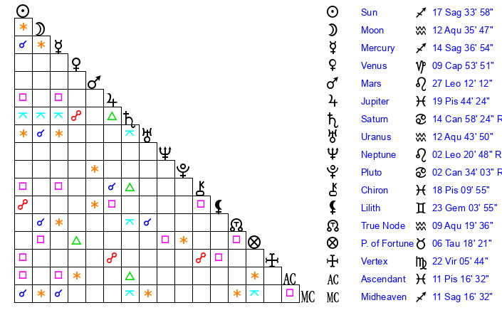 | Moon | 12 Aquarius 26 | 16 Aries 22 | 4 Aquarius 16 |