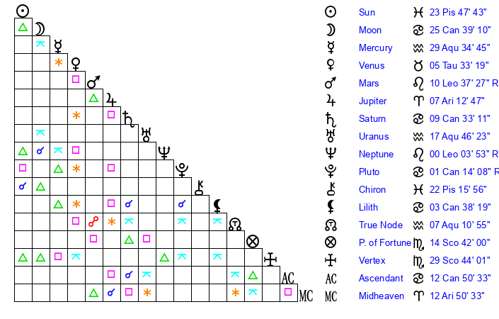 | Sun | 23 Pisces 47 | 24 Pisces 22 | 9 Cancer 28 |