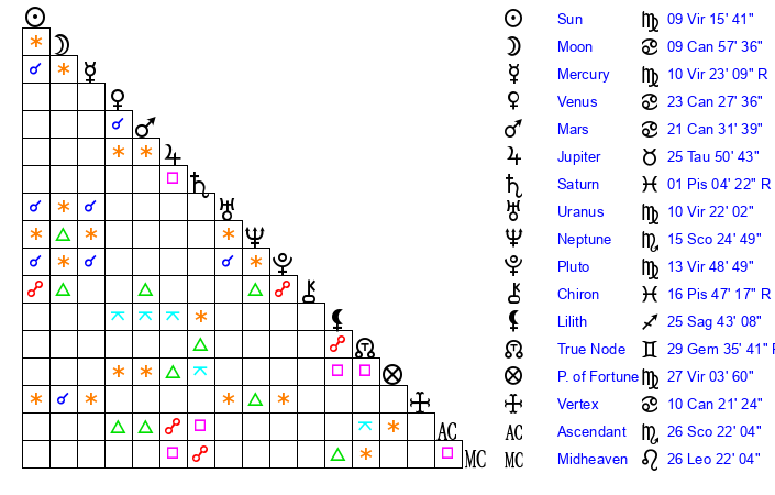 | Sun | 9 Virgo 16 | 9 Virgo 30 | 9 Scorpio 19 |