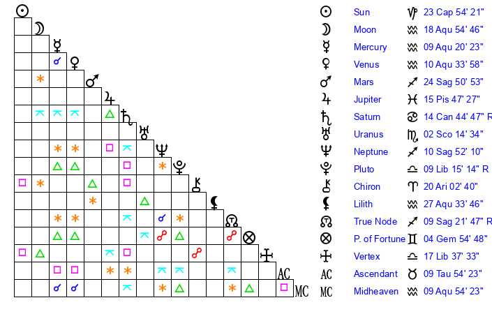 | Moon | 18 Aquarius 53 | 4 Leo 16 | 24 Sagittarius 26 |