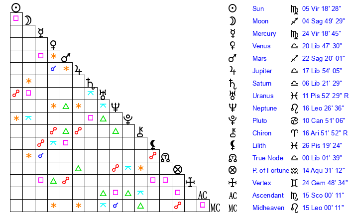 | Sun | 5 Virgo 18 | 6 Virgo 22 | 17 Sagittarius 37 |