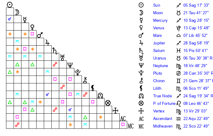| Sun | 5 Sagittarius 17 | 5 Sagittarius 42 | 5 Pisces 41 |