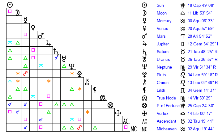| Sun | 18 Capricorn 49 | 19 Capricorn 41 | 12 Aries 19 |