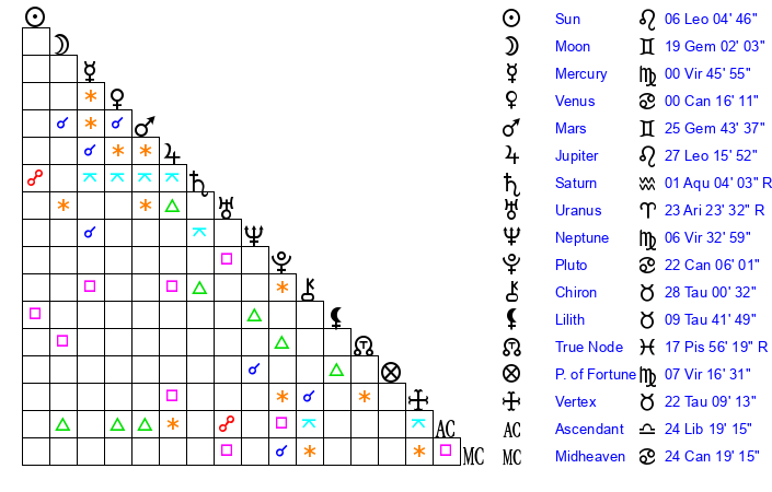 | Neptune | 6 Virgo 33 | 2 Aries 0 | 9 Virgo 40 |