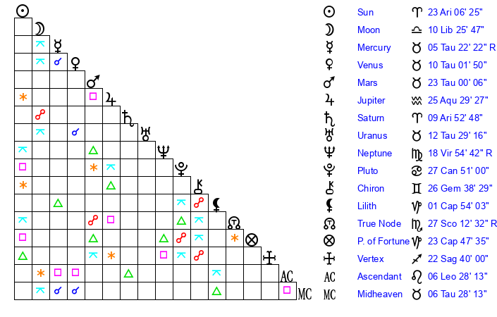 | Sun | 23 Aries 6 | 24 Aries 1 | 16 Cancer 48 |