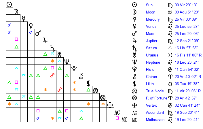 | Mercury | 26 Virgo 0 | 14 Leo 36 | 21 Sagittarius 50 |