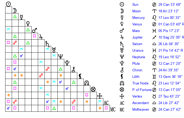 | Moon | 18 Aries 29 | 2 Cancer 37 | 25 Sagittarius 5 |