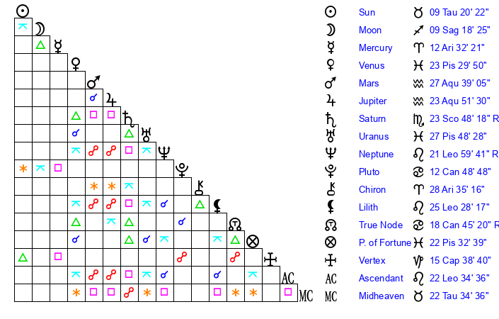 | Uranus | 27 Pisces 49 | 26 Taurus 18 | 29 Pisces 1 |