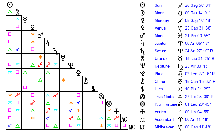 | Moon | 0 Taurus 14 | 18 Capricorn 21 | 20 Gemini 40 |
