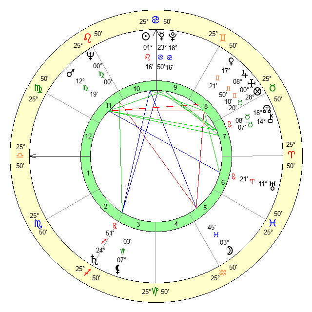 | Sun | 1 Leo 17 | 2 Leo 3 | 4 Scorpio 48 |