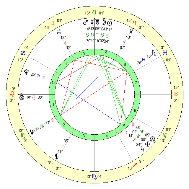 | Moon | 4 Taurus 4 | 9 Aquarius 29 | 9 Leo 44 |