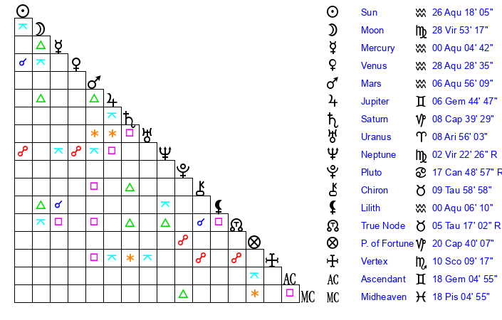 | Sun | 26 Aquarius 18 | 27 Aquarius 16 | 29 Taurus 54 |