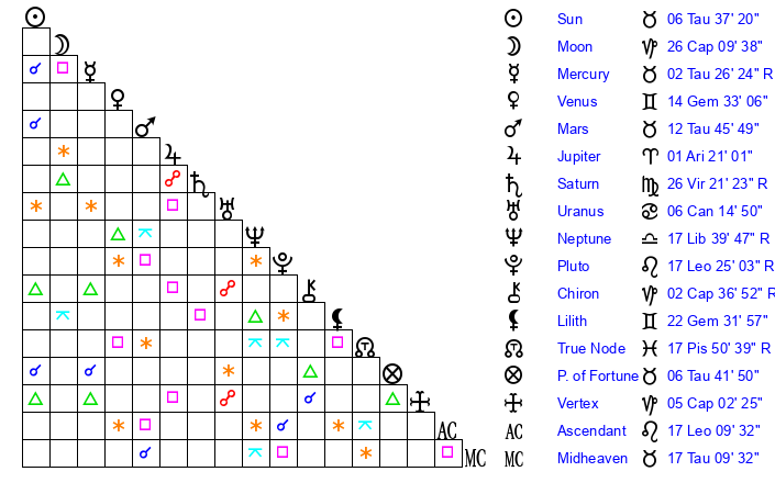 | Moon | 26 Capricorn 9 | 6 Taurus 15 | 29 Virgo 22 |