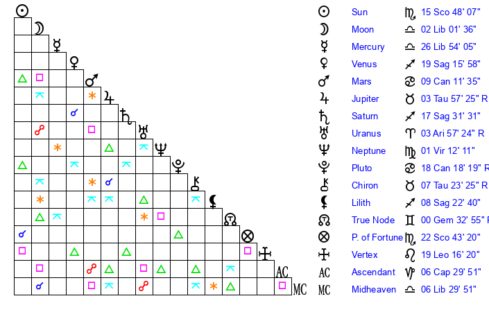 | Sun | 15 Scorpio 48 | 16 Scorpio 17 | 24 Aquarius 17 |