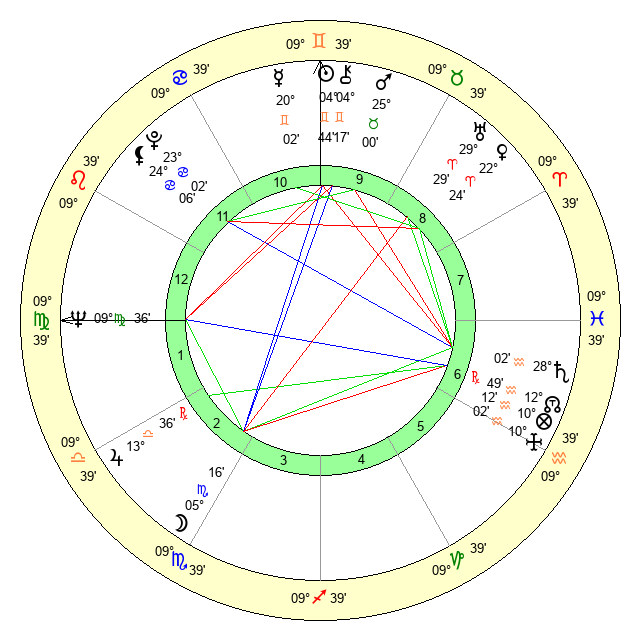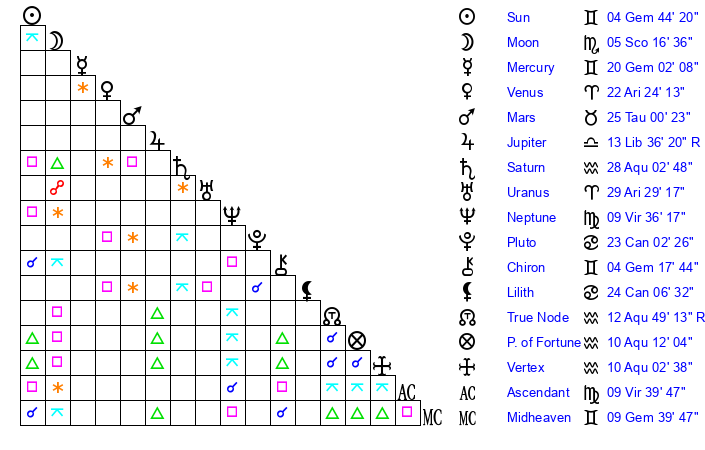 | Sun | 4 Gemini 44 | 5 Gemini 42 | 1 Virgo 47 |