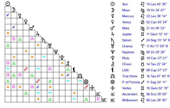 | Mercury | 22 Leo 39 | 4 Leo 56 | 9 Scorpio 32 |
