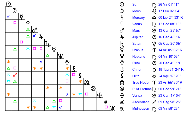 | Sun | 26 Virgo 1 | 27 Virgo 0 | 1 Capricorn 10 |