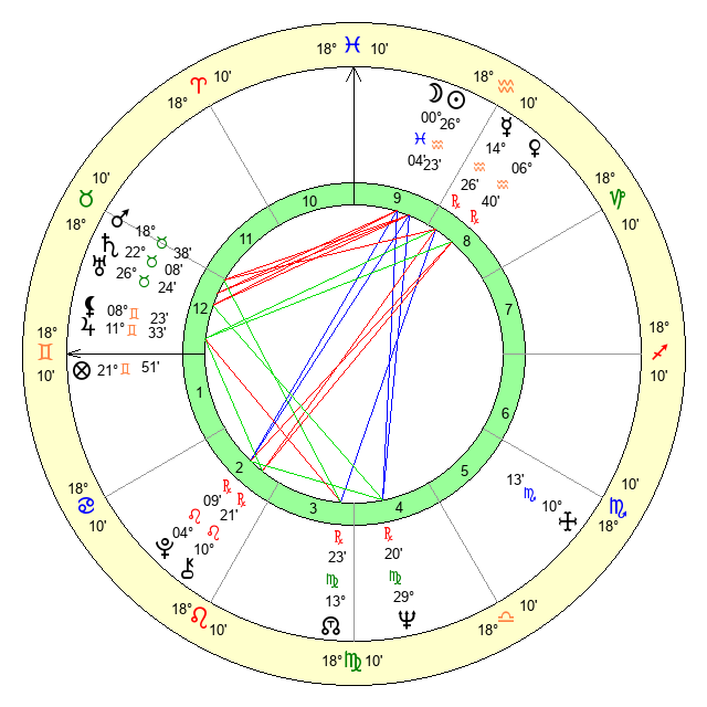 | Moon | 0 Pisces 3 | 2 Libra 31 | 15 Pisces 20 |