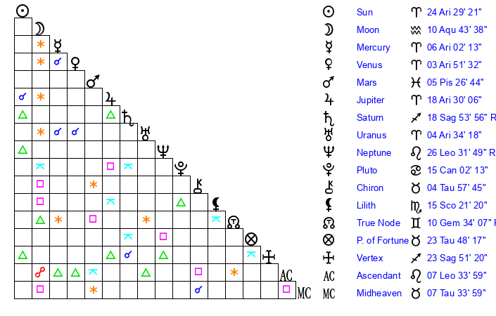 | Venus | 3 Aries 52 | 24 Pisces 42 | 2 Leo 58 |