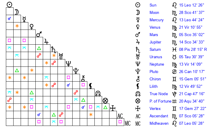 | Sun | 15 Leo 12 | 16 Leo 24 | 13 Scorpio 21 |