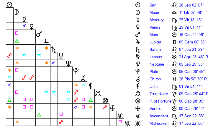 | Moon | 11 Libra 12 | 9 Leo 47 | 27 Virgo 7 |