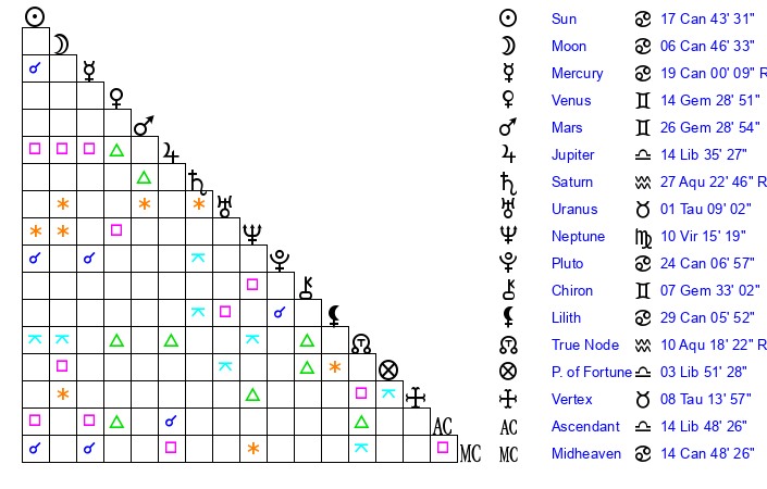 | Sun | 17 Cancer 43 | 18 Cancer 41 | 15 Libra 42 |