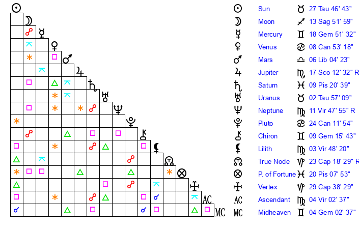 | Moon | 13 Sagittarius 56 | 19 Aquarius 5 | 8 Aries 37 |
