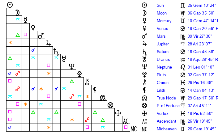 | Mercury | 10 Gemini 46 | 14 Cancer 37 | 13 Libra 52 |