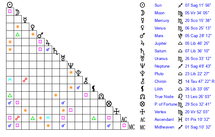 Neptune | 21 Sagittarius 50 | 27 Pisces 8 | 23 Sagittarius 28 |