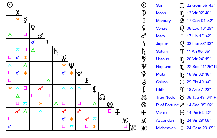 Sun | 22 Gemini 57 | 23 Gemini 53 | 18 Leo 20 |