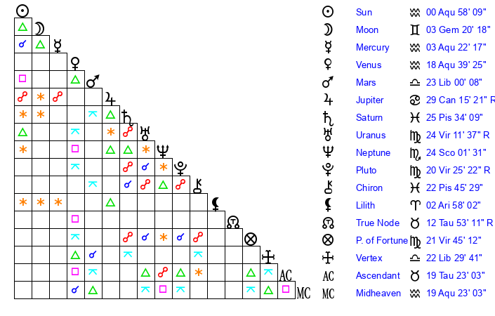 Pluto | 20 Virgo 25 | 1 Aquarius 43 | 19 Virgo 4 |