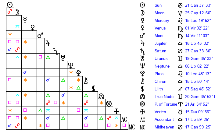 | Sun | 21 Cancer 38 | 22 Cancer 30 | 7 Libra 54 |
