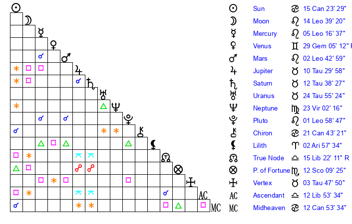 | Moon | 14 Leo 40 | 9 Sagittarius 30 | 25 Virgo 39 |
