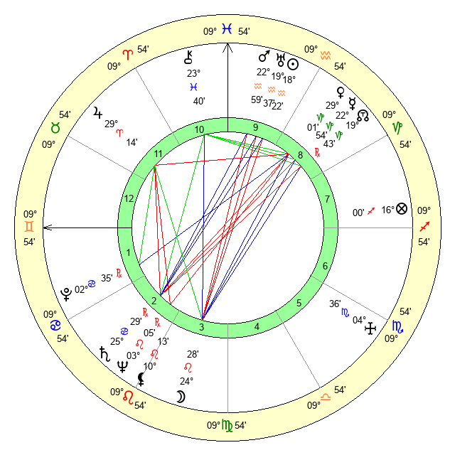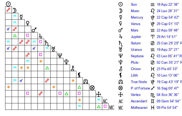 | Sun | 18 Aquarius 22 | 19 Aquarius 10 | 4 Gemini 50 |