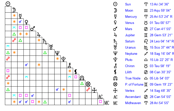 | Moon | 24 Aquarius 0 | 26 Gemini 40 | 4 Scorpio 19 |