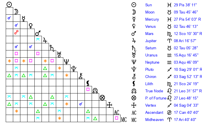 Moon | 9 Taurus 43 | 10 Sagittarius 10 | 18 Aries 38 |