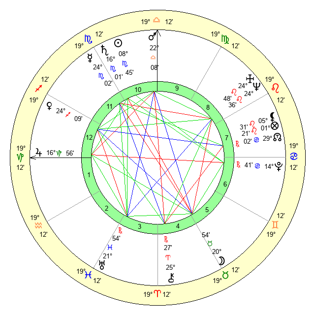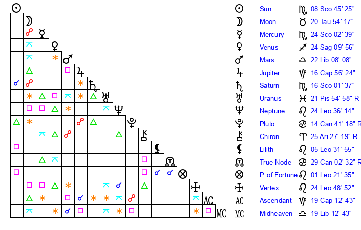 | Saturn | 16 Scorpio 30 | 25 Pisces 39 | 26 Scorpio 3 |