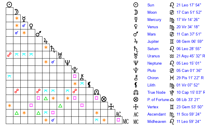 | Neptune | 5 Leo 15 | 1 Aries 44 | 6 Leo 59 |