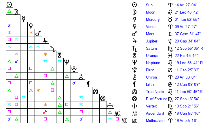 | Neptune | 19 Leo 58 | 0 Aries 11 | 21 Leo 8 |