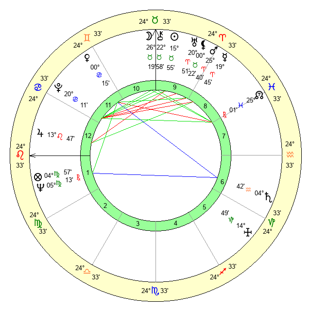 | Moon | 26 Taurus 22 | 10 Virgo 57 | 23 Libra 35 |