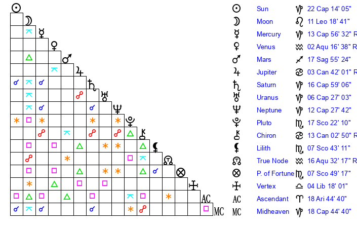 | Sun | 22 Capricorn 14 | 22 Capricorn 45 | 27 Aquarius 46 |