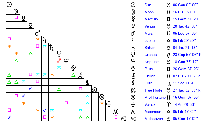 | Neptune | 18 Cancer 33 | 2 Aries 9 | 21 Cancer 34 |