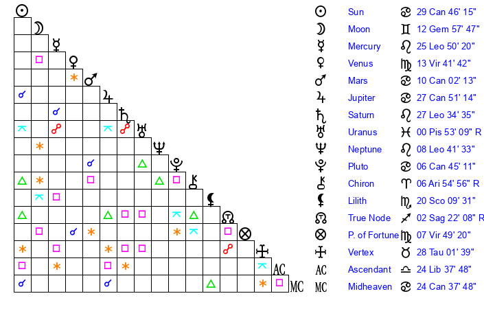 | Moon | 12 Gemini 54 | 16 Cancer 48 | 25 Aries 15 |