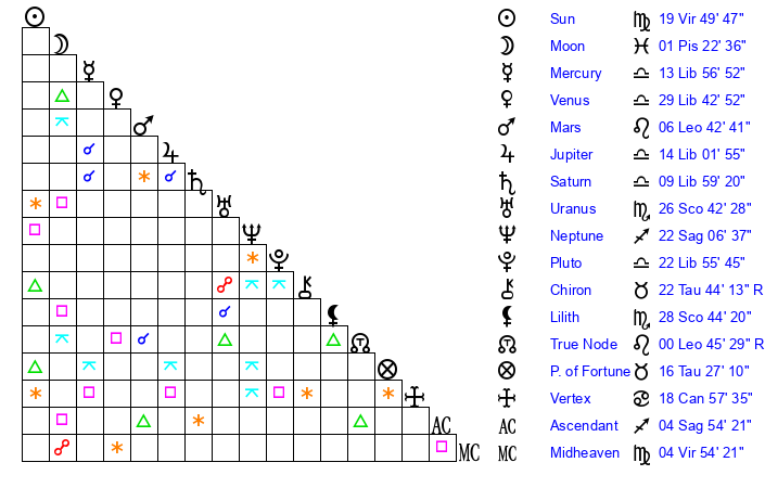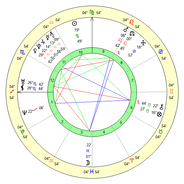 | Sun | 19 Virgo 50 | 20 Virgo 11 | 3 Scorpio 12 |