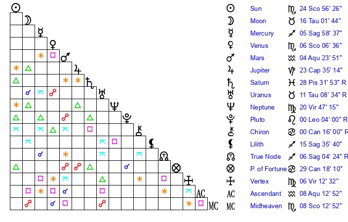 | Sun | 24 Scorpio 56 | 25 Scorpio 36 | 24 Aquarius 21 |