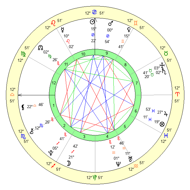 | Mars | 0 Cancer 54 | 11 Virgo 41 | 18 Cancer 53 |