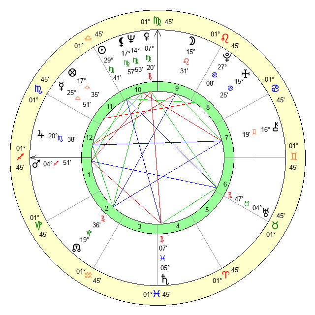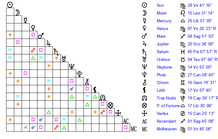 | Neptune | 14 Virgo 53 | 0 Aries 44 | 16 Virgo 45 |