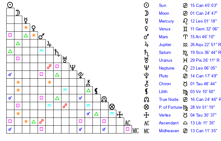 | Jupiter | 26 Aquarius 16 | 6 Cancer 34 | 17 Aquarius 13 |