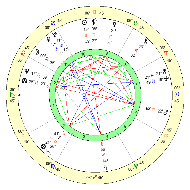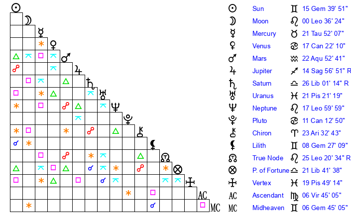 | Sun | 15 Gemini 40 | 16 Gemini 14 | 22 Virgo 33 |