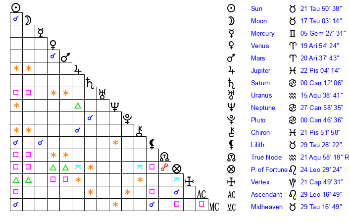| Moon | 16 Taurus 58 | 4 Sagittarius 13 | 27 Taurus 17 |